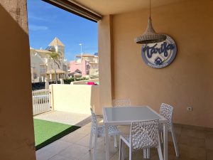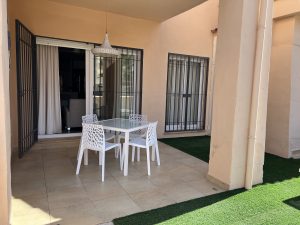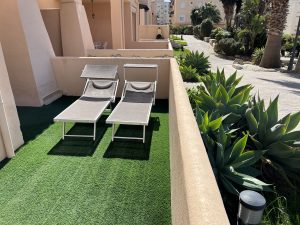 El patio, de 30 m2, dispone de mesa comedor de mosaico marroquí con 4 sillas y dos hamacas en la zona de césped artificial.