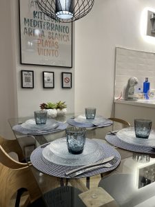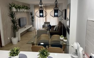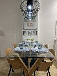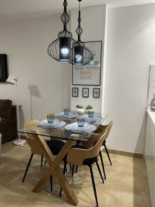 El salón comedor de 25 m2 dispone de un cómodo sofá cama (con colchon de 135 cm de viscolástica), dos butacas individuales, tv led de 40″ , ventilador de techo y mesa de comedor de 150cm con 4 sillas.