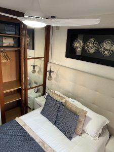 El dormitorio está equipado con una cama doble de 135 cm con colchón de viscolástica, televisor, ventilador de techo y armario empotrado.