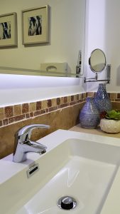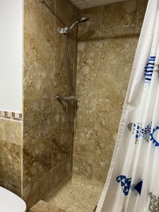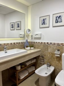 El cuarto de baño dispone de ducha, dispensador de jabón y champú, toallas de baño, toallas de lavabo, y secador de pelo.